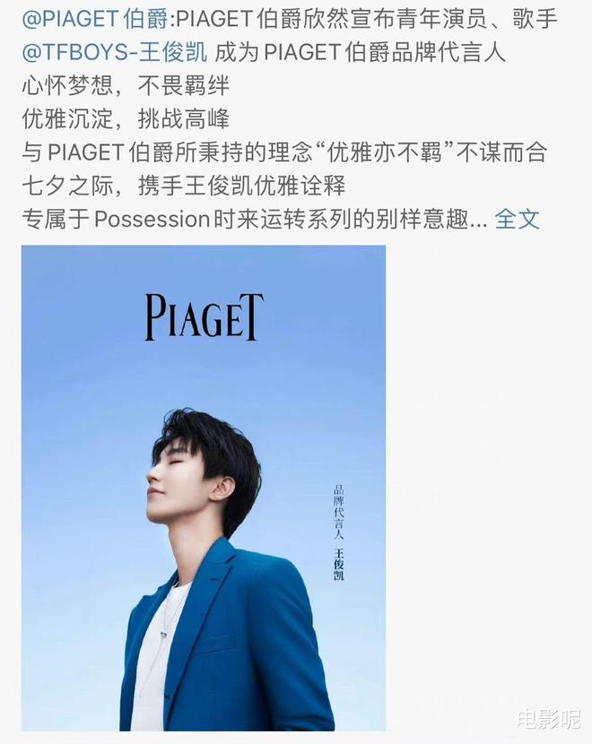 王俊凱正式官宣新代言,新品牌伯爵PIAGET對王俊凱也是無條件的信任,沒有考察期,直接空降為品牌代言人。而這個(gè)品牌是毫無疑問的世界頂級腕表珠寶品牌。比這個(gè)品牌高一個(gè)等級的奢表,內(nèi)娛沒有人能拿到,和這個(gè)品牌同等級的奢表都在批發(fā)品牌大使,只有我們王俊凱是唯一直接空降,成為該品牌的全球全線品牌代言人。