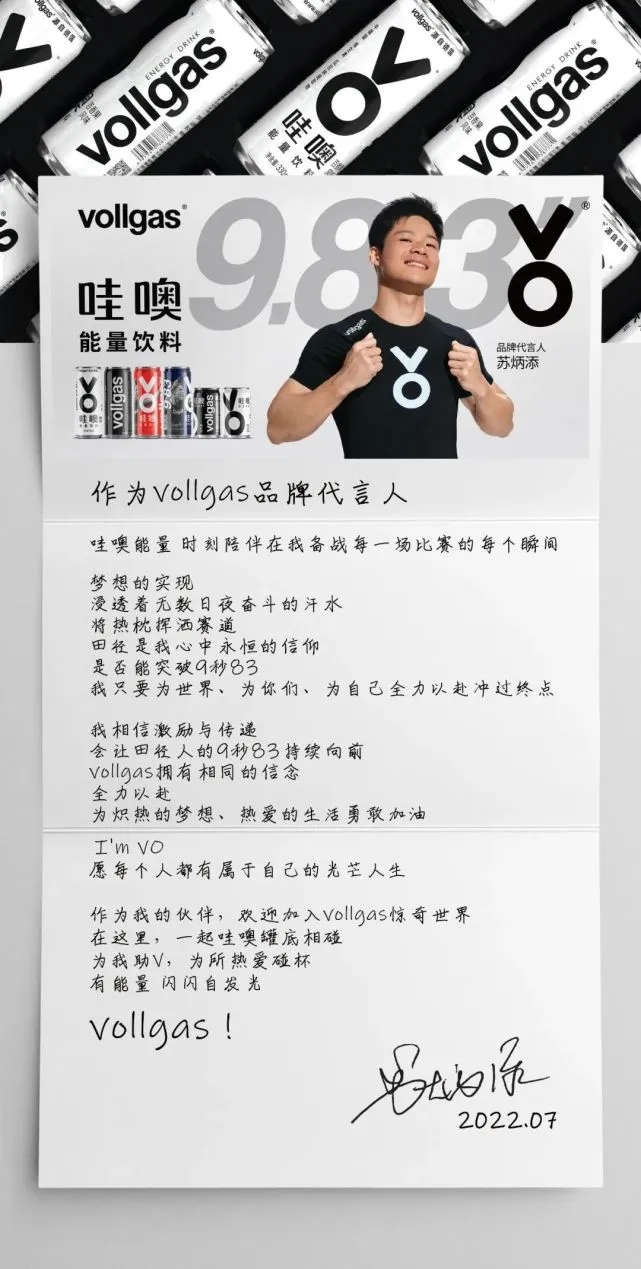 從首次代表中國(guó)出現(xiàn)在國(guó)際重量級(jí)的田徑賽場(chǎng)上以來(lái),蘇炳添就從未停止過(guò)努力的步伐。通過(guò)科學(xué)的方法以及十年如一日的勤奮訓(xùn)練,突破亞洲人的生理極限,蘇炳添最終在2021年的東京奧運(yùn)會(huì)賽場(chǎng)上創(chuàng)造了亞洲100米田徑新紀(jì)錄。這樣為熱愛(ài)的事業(yè)全力以赴的精神,與vollgas的品牌價(jià)值觀完美契合。