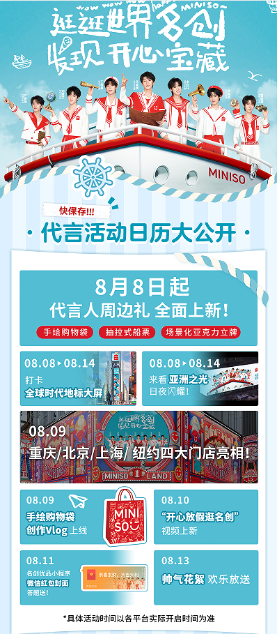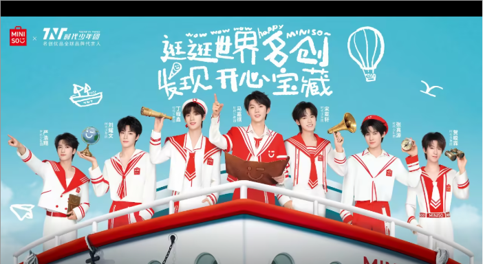 8 月 8 日,名創(chuàng)優(yōu)品正是官宣時(shí)代少年團(tuán)(明星代言公司)為品牌全球代言人。在發(fā)布的官方代言大片中,時(shí)代少年團(tuán)化身七位航海少年揚(yáng)帆出海出發(fā)探尋世界各地的開心寶藏,從游歷奇妙的潮玩島嶼、到穿越變幻的季節(jié)之旅、甚至?xí)秤螘r(shí)尚的美妝都會(huì),影片中的內(nèi)容也對應(yīng)了近年來名創(chuàng)優(yōu)品在海外的發(fā)展,如今全球 112 個(gè)國家和地區(qū)都有名創(chuàng)的身影,每一個(gè)角落都隱藏著閃閃發(fā)光的開心寶藏,名創(chuàng)優(yōu)品希望大家能夠在時(shí)代少年團(tuán)的帶領(lǐng)下一逛世界名創(chuàng),發(fā)現(xiàn)開心寶藏。