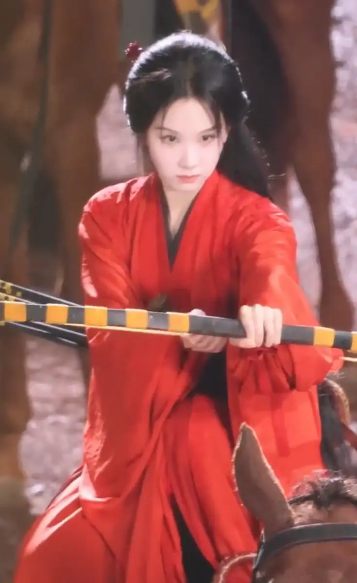 陳都靈一身紅衣颯爽帥氣 雙手拉弓箭眼神銳利
