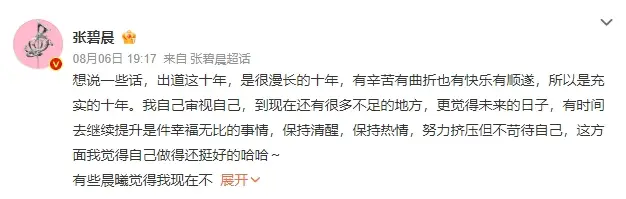 想說(shuō)一些話,出道這十年,是很漫長(zhǎng)的十年,有辛苦有曲折也有快樂(lè)有順?biāo)?,所以是充?shí)的十年。我自己審視自己,到現(xiàn)在還有很多不足的地方,更覺(jué)得未來(lái)的日子,有時(shí)間去繼續(xù)提升是件幸福無(wú)比的事情,保持清醒,保持熱情,努力擠壓但不苛待自己,這方面我覺(jué)得自己做得還挺好的哈哈~