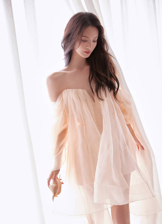 金晨身穿白色抹胸紗裙。