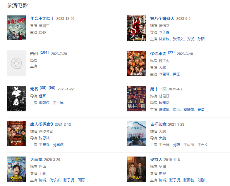 2021年1月25日,特邀領銜主演的都市情感劇《假日暖洋洋》開播;2月12日,參演的電影《唐人街探案3》上映;3月5日,出演陳建斌執(zhí)導的電影《第十一回》上映 ;5月17日,大鵬亮相融創(chuàng)文化戰(zhàn)略布局發(fā)布會,透露自己的新片定名為《一個人的球隊》;9月9日,主演的的網(wǎng)劇《雙探》播出;參加脫口秀《我的青銅時代》。