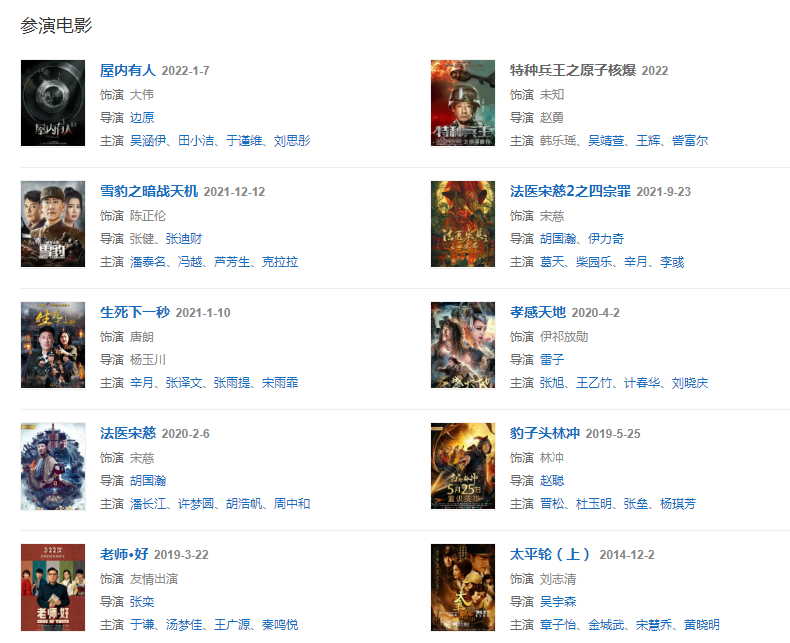 代表作品:五號特工組、我的二哥二嫂、不可能完成的任務(wù)、巡回檢察組、藍(lán)軍出擊、號手就位