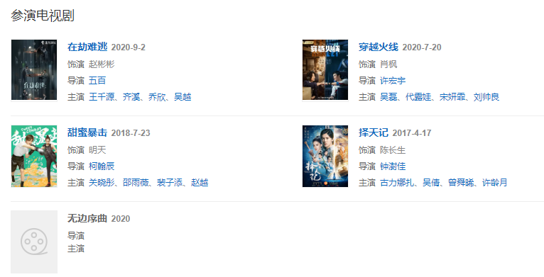 2020年,擔任騰訊視頻綜藝節(jié)目《創(chuàng)造營2020》教練成員;9月2日,主演的輕科幻懸疑劇《在劫難逃》播出 ;11月,擔任綜藝節(jié)目《哈哈哈哈哈》旅行社成員。