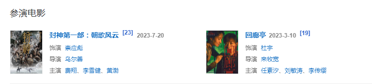 2023年3月,出演懸疑電影《回廊亭》、懸疑劇《回響》;7月20日,出演的神話史詩電影《封神第一部:朝歌風云》上映 。
