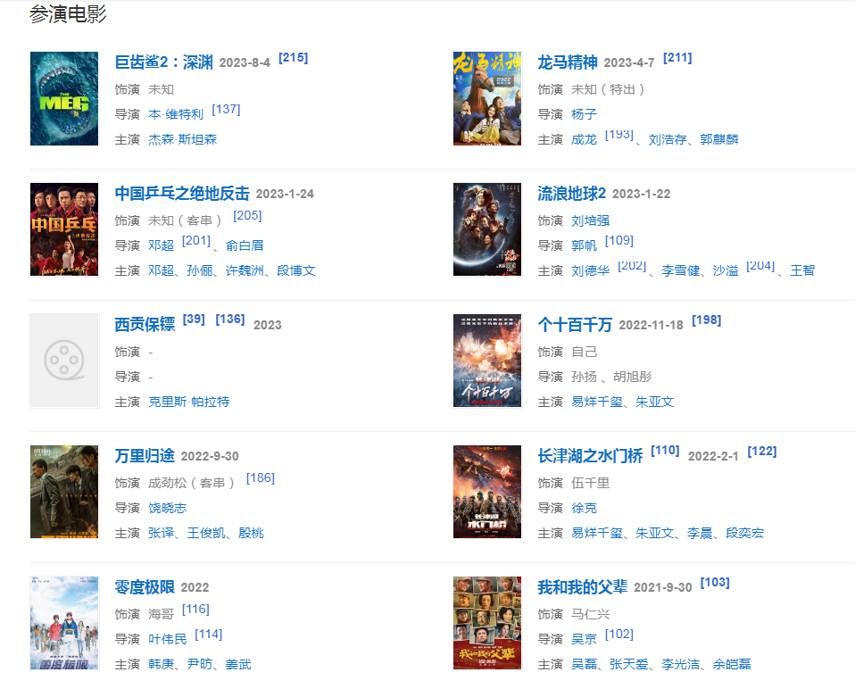 代表作品:戰(zhàn)狼、戰(zhàn)狼Ⅱ、流浪地球、殺破狼2、攀登者、長津湖、太極宗師、我是特種兵之利刃出鞘