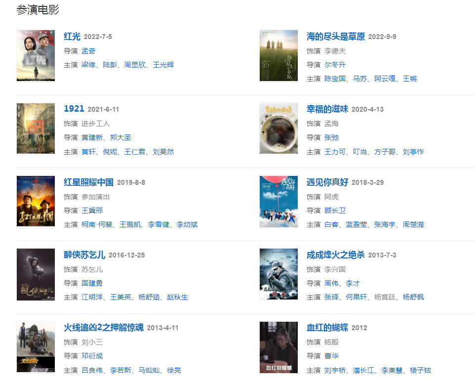 2021年5月25日,出演的重大革命歷史題材劇《光榮與夢(mèng)想》在北京衛(wèi)視、東方衛(wèi)視及騰訊視頻、愛奇藝、優(yōu)酷同步播出 ;9月15日,與安悅溪主演的電視劇《在希望的田野上》在騰訊視頻播出;參演電影《1921》; 參演電視劇《理想照耀中國(guó)》。