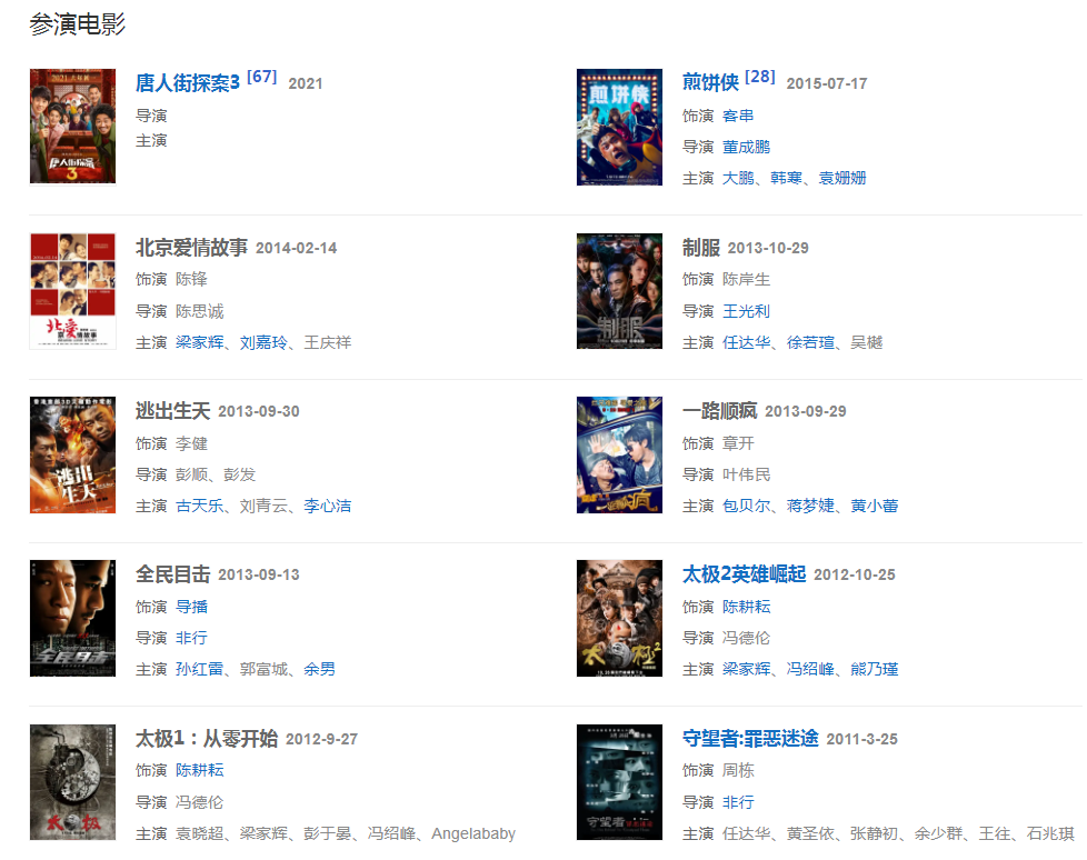 代表作品:北京愛(ài)情故事、唐人街探案系列、法官媽媽、春風(fēng)沉醉的夜晚、士兵突擊、戰(zhàn)神、遠(yuǎn)大前程