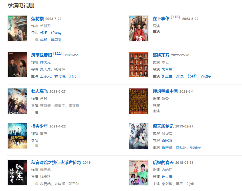 代表作品:梅艷芳菲、流星蝴蝶劍、家的N次方、北京青年