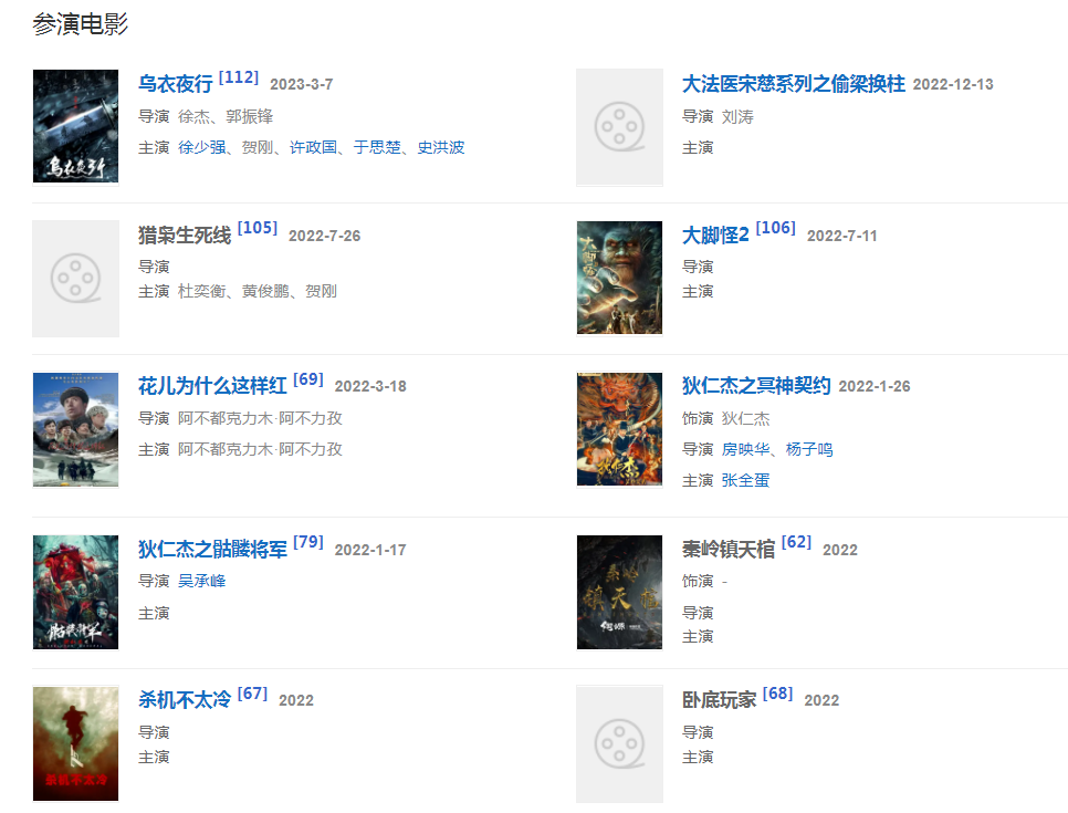 2022117日,賀剛領(lǐng)銜主演的懸疑動(dòng)作電影《狄仁杰之骷髏將軍》在騰訊視頻全網(wǎng)獨(dú)播;126日,主演的古裝探案電影《狄仁杰之冥神契約》在騰訊視頻獨(dú)家上線; 20223月,賀剛主演的電影《花兒為什么這樣紅》官宣定檔318日全國(guó)公映,并發(fā)布了首款先導(dǎo)預(yù)告。 2022318日,賀剛主演的電影《劌心劍》宣布定檔416日登陸全國(guó)影院。