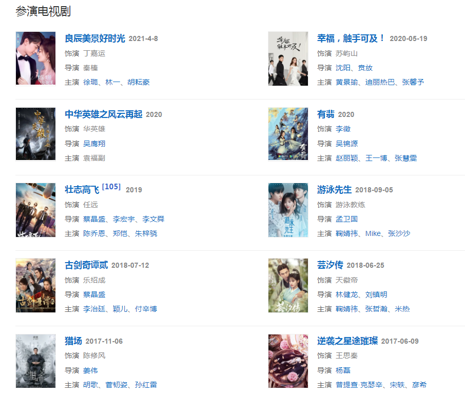 2015年參演古裝玄幻劇《幻城》。2016年參演溫情勵志時尚劇《媽媽向前沖沖沖》。