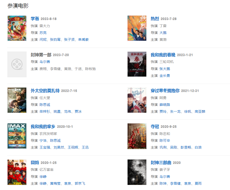代表作品:奪冠、冰之下、一出好戲、瘋狂的外星人、斗牛、殺生、瘋狂的石頭、心花路放、親愛的、民兵葛二蛋、鋒刃、泰囧、正義之道、臨時演員、男人好難、這就是命