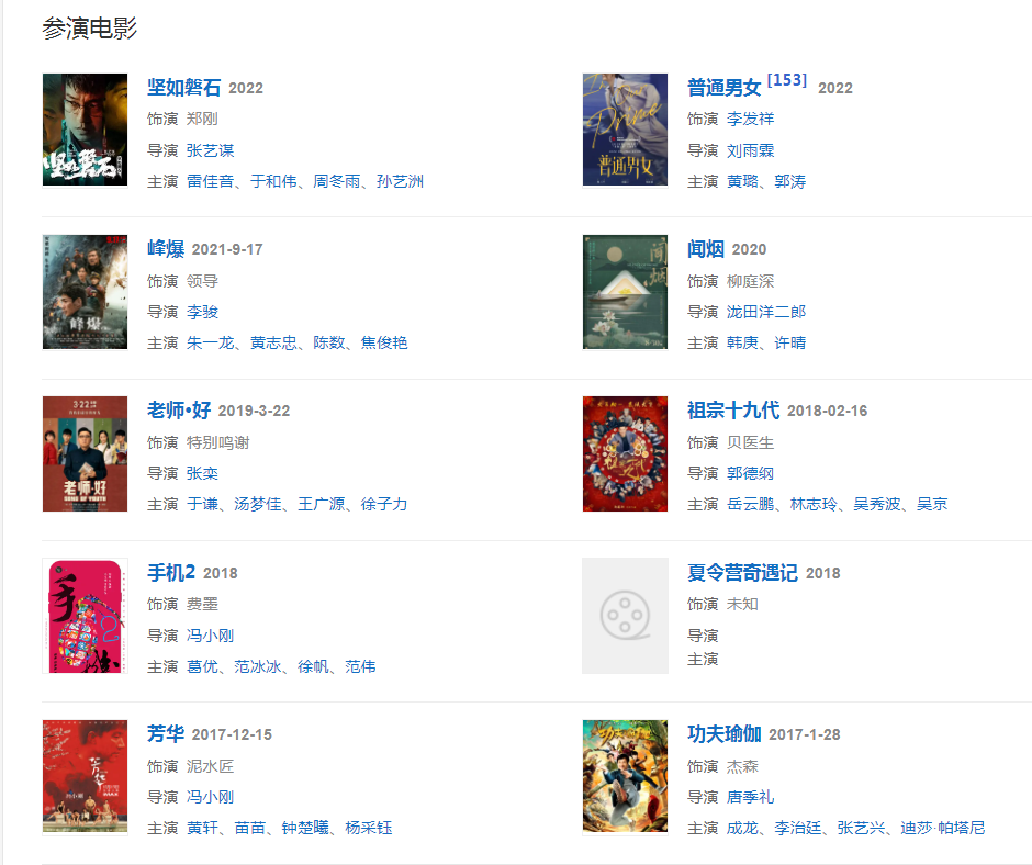 代表作品:康熙微服私訪記、鐵齒銅牙紀(jì)曉嵐、忠誠、金婚、頑主、手機(jī)、一聲嘆息、建國大業(yè)、中國1945之重慶風(fēng)云、一九四二