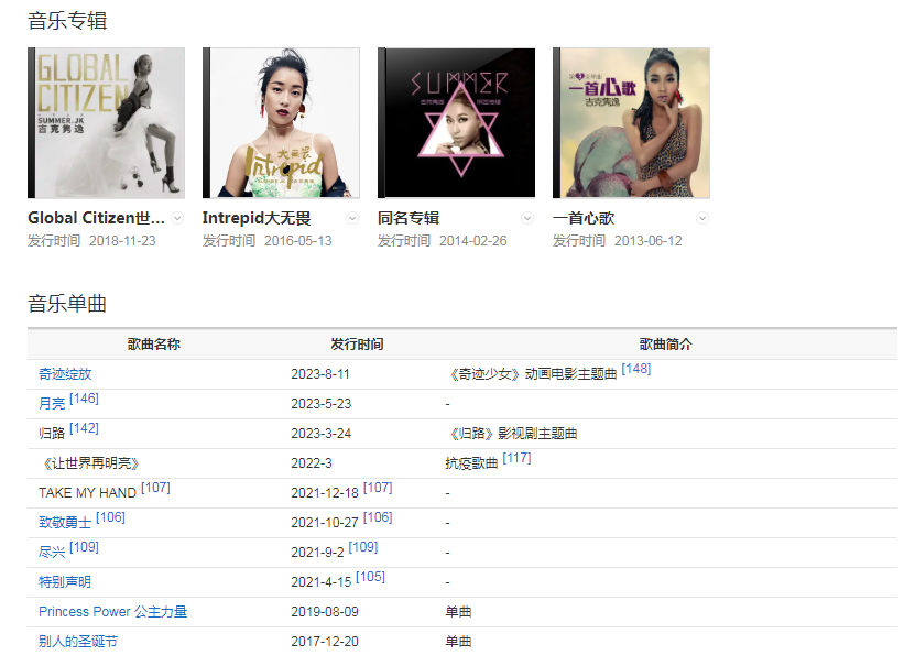 2018年,獲得亞洲音樂盛典年度最佳女歌手獎;同年,推出第3張個人音樂專輯《Global Citizen世界公民》,并開啟吉克雋逸世界公民公告現(xiàn)場。