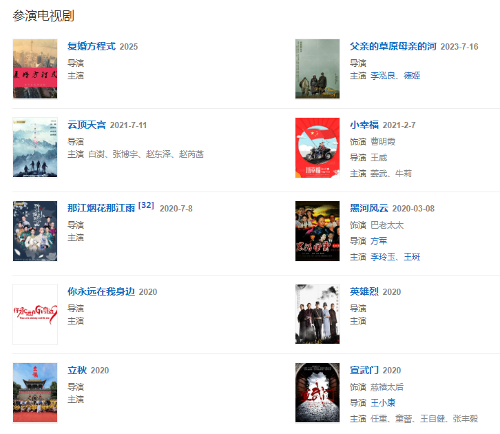 2001年,主演近代傳奇劇《大宅門(mén)》和歷史古裝劇《康熙王朝》 。