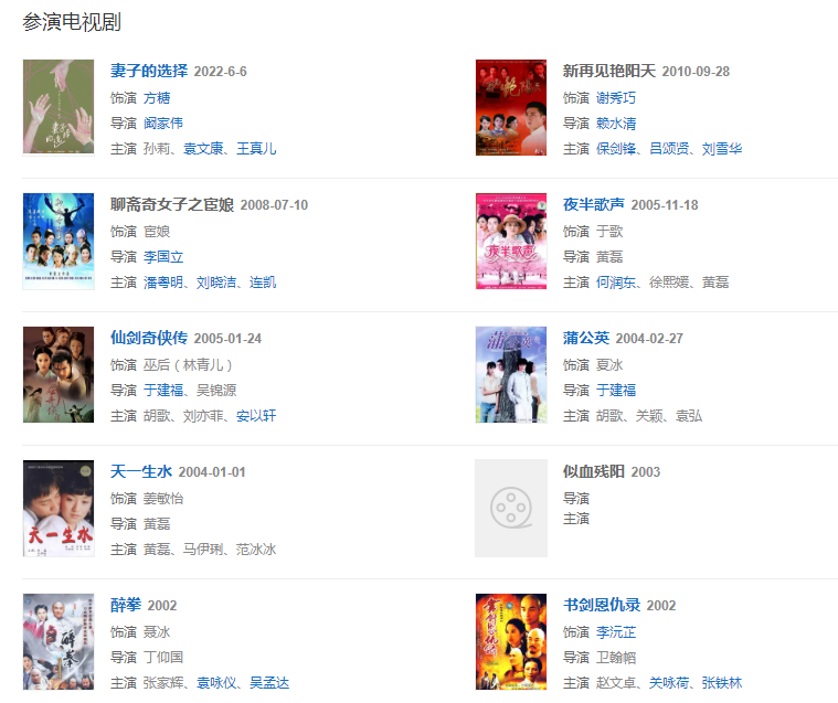 代表作品:仙劍奇?zhèn)b傳、聊齋奇女子、新再見艷陽天、天地傳說之魚美人