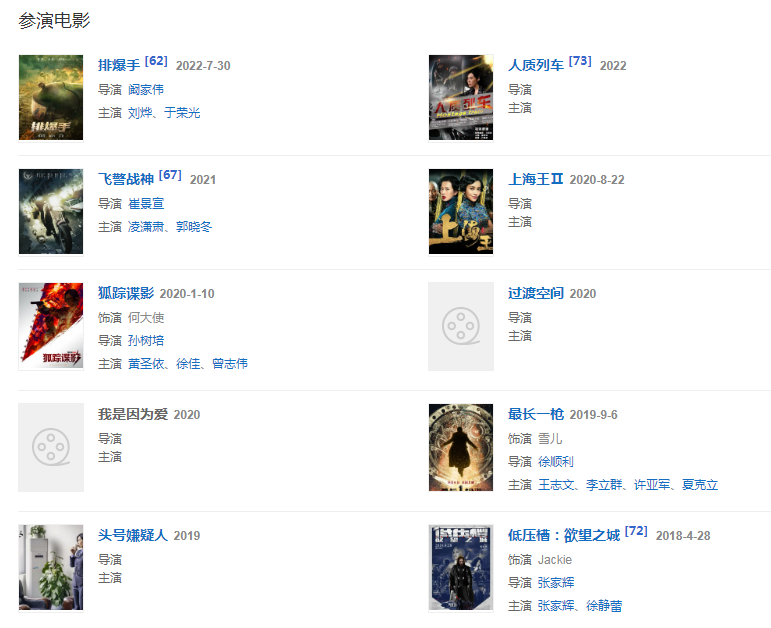 代表作品:月蝕、驚蟄、左右、殺生、戰(zhàn)狼、敢死隊2、全民目擊、無人區(qū)、圖雅的婚事、智取威虎山、戰(zhàn)狼Ⅱ