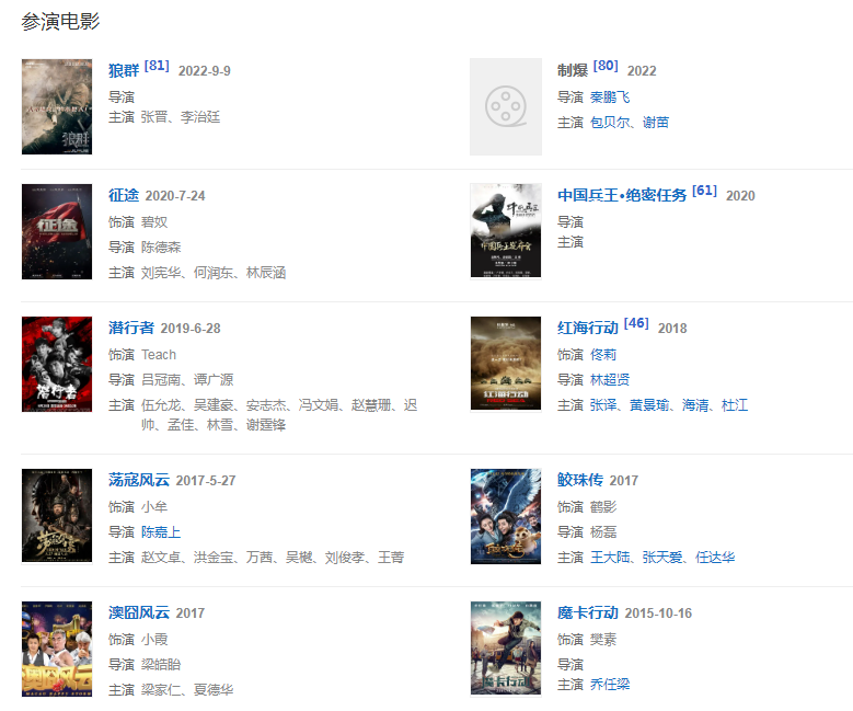 代表作品:戰(zhàn)無雙、午夜出租車、蘇乞兒、紅海行動、特戰(zhàn)榮耀