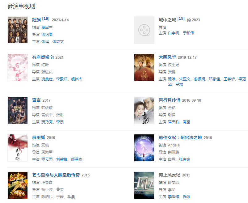 代表作品:乞丐皇帝與大腳皇后傳奇、屏里狐、誓言、狂飆