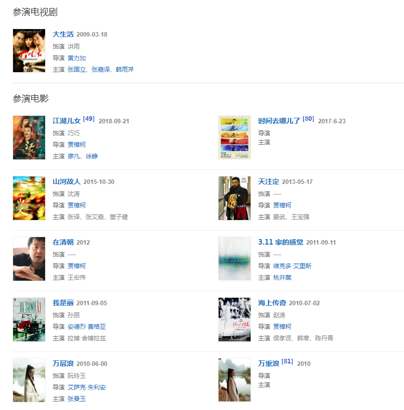 代表作品:站臺(tái)、我是麗、三峽好人、萬(wàn)層浪、二十四城記、山河故人、天注定、海上傳奇、大生活