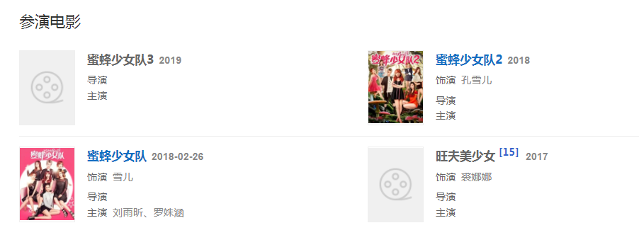 2018年2月26日,參演的根據(jù)同名綜藝節(jié)目衍生的都市勵志網(wǎng)絡(luò)電影《蜜蜂少女隊》在愛奇藝上線,并在片中飾演可愛的雪兒,演繹青春時期堅持夢想、奮力追逐的勵志故事。