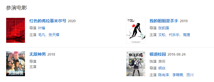 2016年,領(lǐng)銜主演明焱執(zhí)導喜劇電影《極道校園》,在片中飾演學校醫(yī)務室的青年女醫(yī)師蕭若。