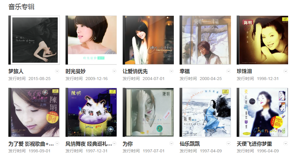 自九十年代初步入歌壇,陳明作為國內(nèi)的第一批簽約歌手,在親歷了中國原創(chuàng)流行音樂的數(shù)載沉浮后,至今仍是音樂界活躍的實(shí)力派歌手之一。無論是卡帶盛行的年代,還是網(wǎng)絡(luò)下載的今天,她的作品都同時(shí)擁有著傲人的銷量和極高的流行性與傳唱度。