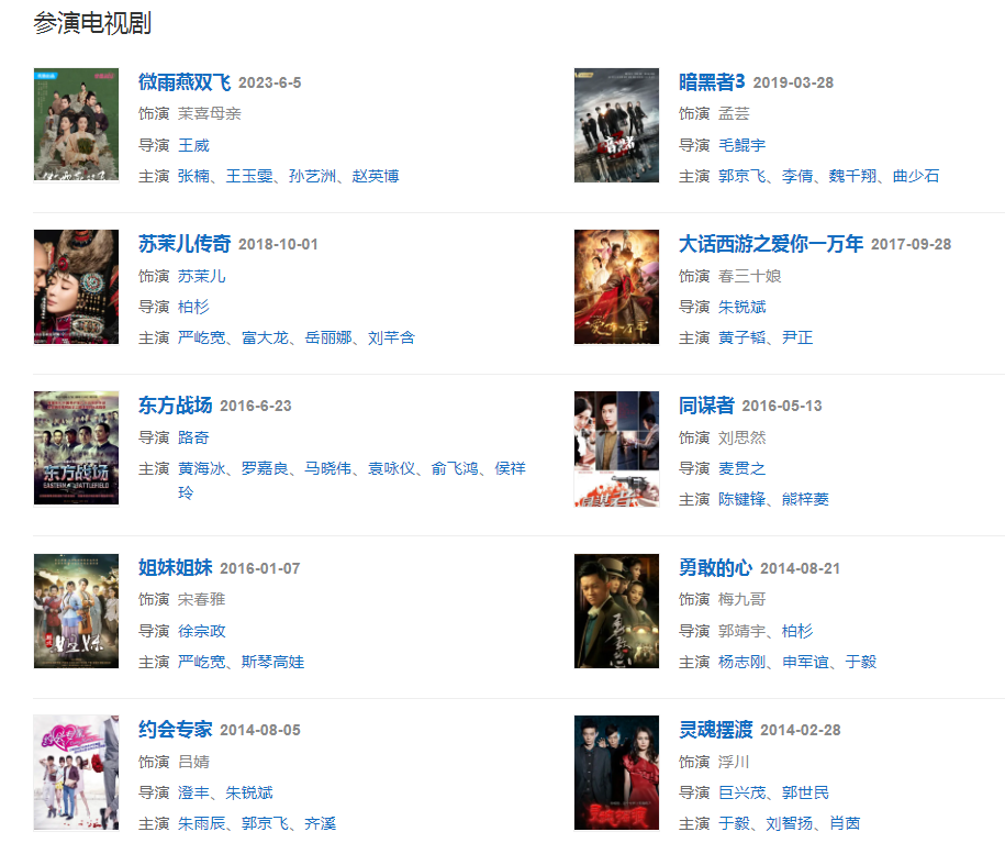 代表作品:鐵梨花、靈魂擺渡、紅娘子、勝女的代價、刑名師爺、勇敢的心、血誓、戀了愛了