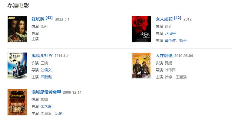 2006年,出演張藝謀執(zhí)導(dǎo)的古裝片《滿城盡帶黃金甲》,憑借該片提名金雞百花電影節(jié)最佳新人獎,獲得“賀歲十年歡樂盛典”最受歡迎電影女配角獎。