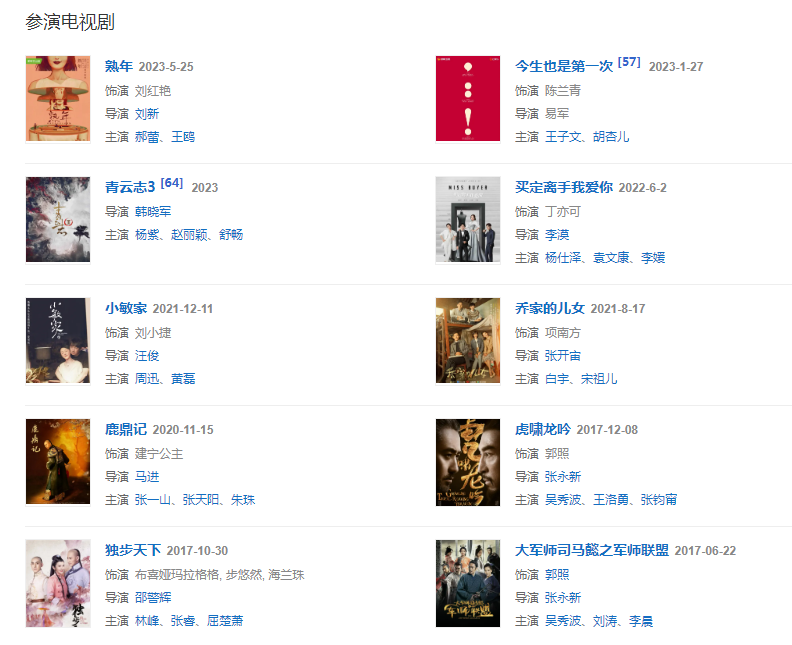 代表作品:甄嬛傳、陸貞傳奇、加油愛人、青云志、軍師聯(lián)盟、獨(dú)步天下