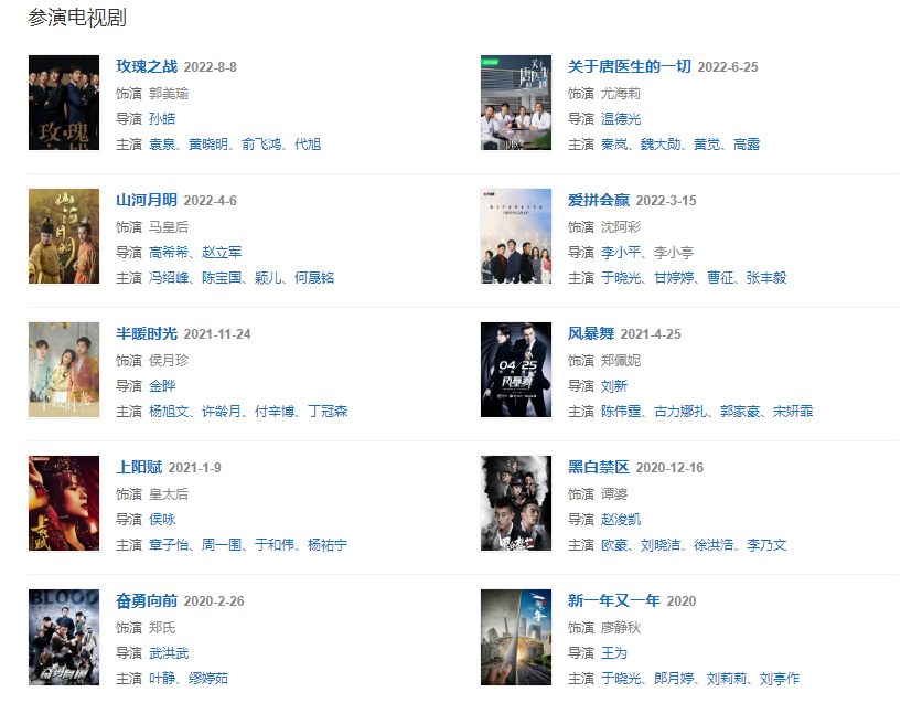2020年,參演電視劇《黑白禁區(qū)》,在劇中飾演譚婆。