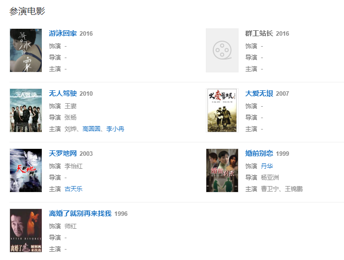 1996年,參演北京青年電影制片廠攝制的電影《離婚了就別來(lái)找我》,獲得中國(guó)電影金雞獎(jiǎng)最佳女配角提名。
