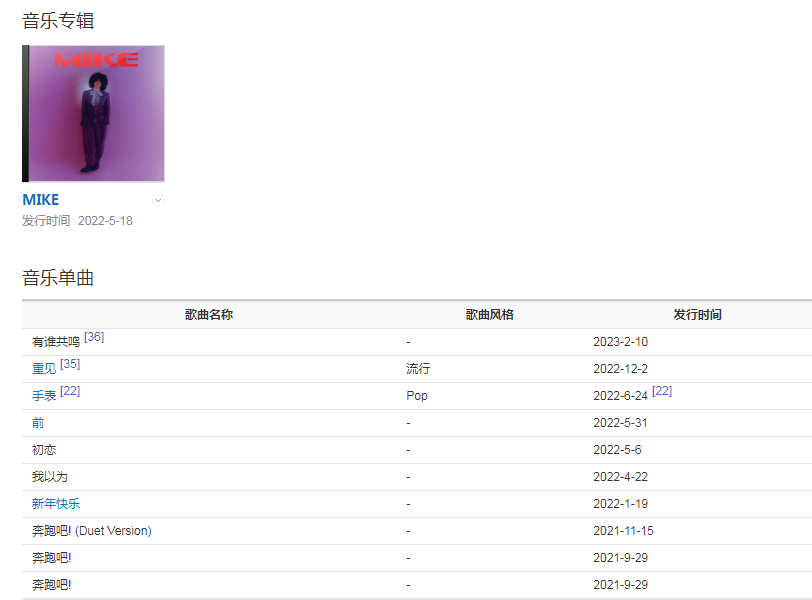 2022年1月,獲得2021年度叱咤樂壇流行榜頒獎典禮叱咤樂壇生力軍男歌手銅獎;4月,參加的音樂獻(xiàn)禮節(jié)目《聲生不息》在湖南衛(wèi)視播出 ,并憑借歌曲《初戀》最終拿下了首期節(jié)目的第1名,這也讓他被更多的內(nèi)地觀眾所認(rèn)識;5月18日,推出首張個人音樂專輯《MIKE》 。