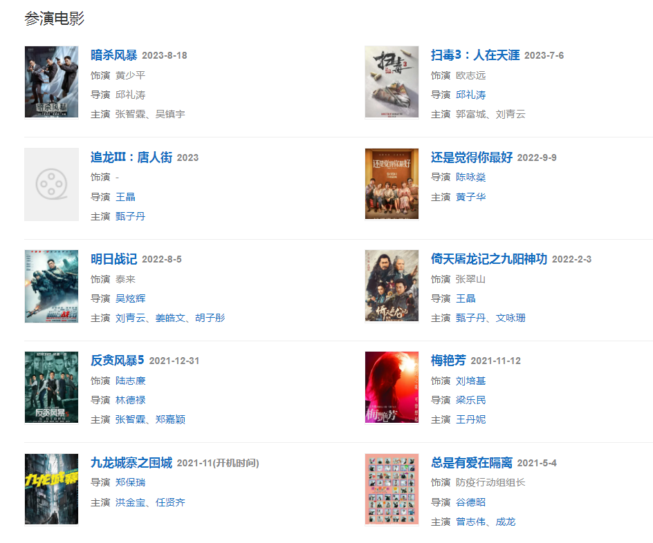 代表作品:神雕俠侶、尋秦記、保持通話、竊聽風云、一個好爸爸、寶貝計劃、毒戰(zhàn)、掃毒、殺破狼·貪狼、刑事偵緝檔案IV、犯罪現場